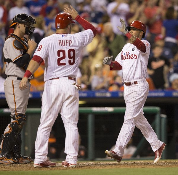 PHILADELPHIA, PA - JUNE 17: Freddy Galvis #13 of the Philadelphia Phillies high fives Cameron Rupp #29 after hitting a three run home run in the bottom of the seventh inning against the Baltimore Orioles on June 17, 2015 at the Citizens Bank Park in Philadelphia, Pennsylvania. The Orioles defeated the Phillies 6-4. (Photo by Mitchell Leff/Getty Images)
