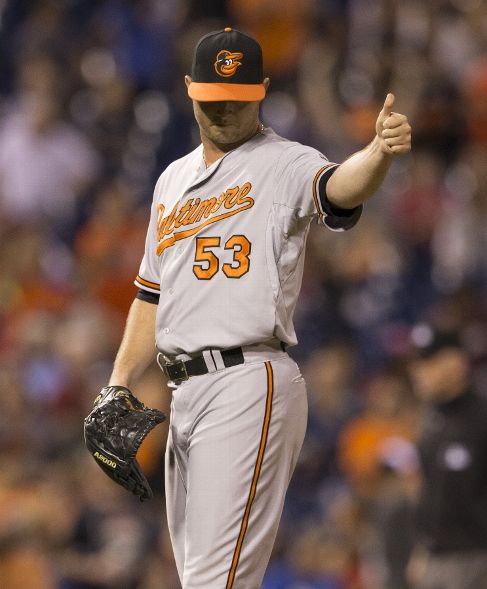 PHILADELPHIA, PA - JUNE 17: Zach Britton #53 of the Baltimore Orioles gives a thumbs up after earning the save against the Philadelphia Phillies on June 17, 2015 at the Citizens Bank Park in Philadelphia, Pennsylvania. The Orioles defeated the Phillies 6-4. (Photo by Mitchell Leff/Getty Images)