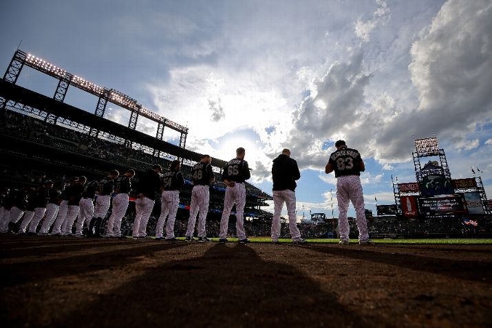 DENVER, CO - JUNE 17: The Colorado Rockies stand on the field as the National Anthem plays before a game against the Houston Astros during Interleague play at Coors Field on June 17, 2015 in Denver, Colorado. (Photo by Justin Edmonds/Getty Images)