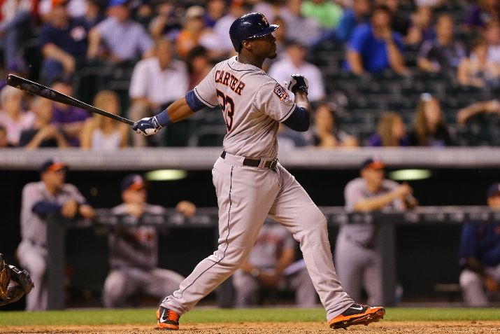 DENVER, CO - JUNE 17: Chris Carter #23 of the Houston Astros watches his two-run home run in the ninth inning against the Colorado Rockies during Interleague play at Coors Field on June 17, 2015 in Denver, Colorado. (Photo by Justin Edmonds/Getty Images)