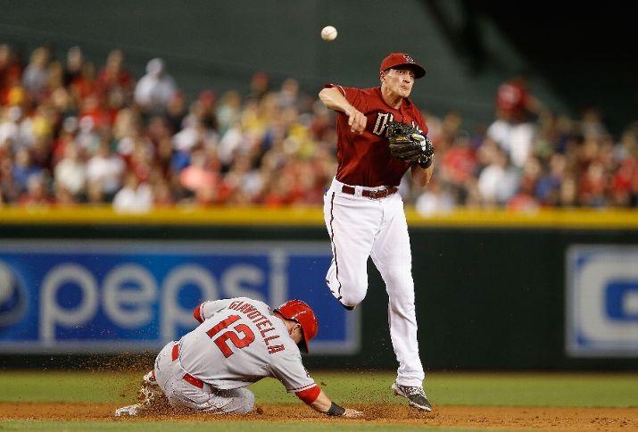 PHOENIX, AZ - JUNE 17: Infielder Nick Ahmed #13 of the Arizona Diamondbacks throws over the sliding Johnny Giavotella #12 of the Los Angeles Angels to complete a double play during the third inning of the MLB game at Chase Field on June 17, 2015 in Phoenix, Arizona. (Photo by Christian Petersen/Getty Images)