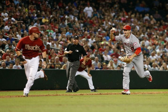 PHOENIX, AZ - JUNE 17: Infielder David Freese #6 of the Los Angeles Angels chases Chris Owings #16 of the Arizona Diamondbacks in a run down during the sixth inning of the MLB game at Chase Field on June 17, 2015 in Phoenix, Arizona. (Photo by Christian Petersen/Getty Images)