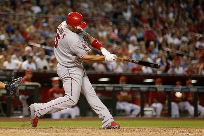 PHOENIX, AZ - JUNE 17: Albert Pujols #5 of the Los Angeles Angels hits a RBI on a ground ball out against the Arizona Diamondbacks during the sixth inning of the MLB game at Chase Field on June 17, 2015 in Phoenix, Arizona. (Photo by Christian Petersen/Getty Images)