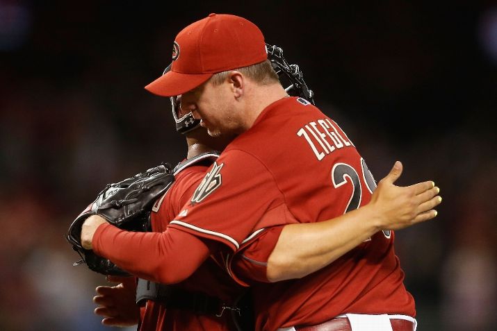 PHOENIX, AZ - JUNE 17: Relief pitcher Brad Ziegler #29 of the Arizona Diamondbacks hugs catcher Welington Castillo #7 after defeating the Los Angeles Angels 3-2 in the MLB game at Chase Field on June 17, 2015 in Phoenix, Arizona. (Photo by Christian Petersen/Getty Images)