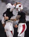 GLENDALE, ARIZONA - SEPTEMBER 02: Quarterback Chris Streveler (R) #15 of the Arizona Cardinals greets Brett Hundley #7 during a NFL team training camp at State Farm Stadium on September 02, 2020 in Glendale, Arizona. (Photo by Christian Petersen/Getty Images)
