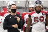 GLENDALE, ARIZONA - AUGUST 28: Head coach Kliff Kingsbury of the Arizona Cardinals stands on the sidelines alongside defensive-end Adam Shuler #69 during the Red & White Practice at State Farm Stadium on August 28, 2020 in Glendale, Arizona. (Photo by Christian Petersen/Getty Images)